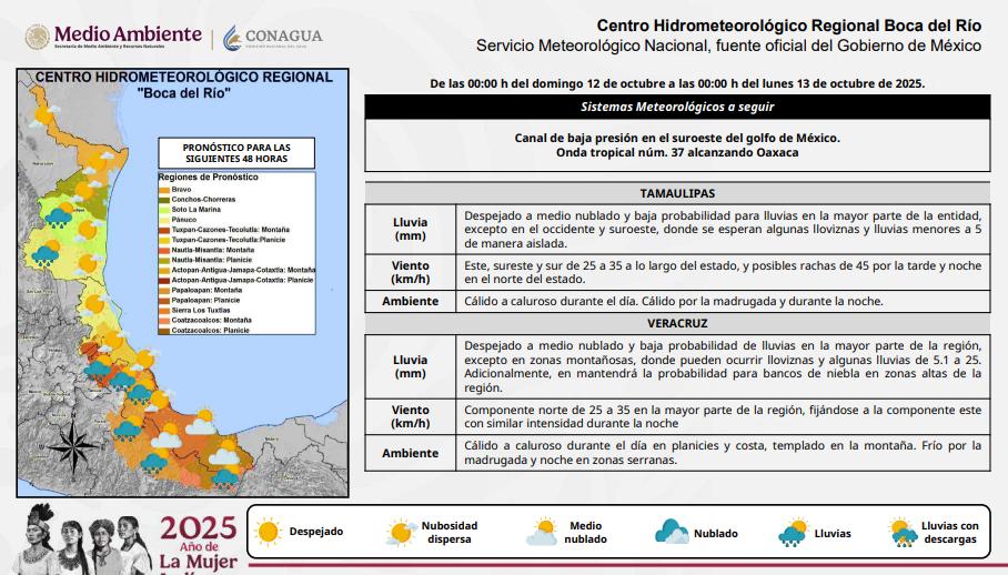 La presencia de un canal de baja presión en el suroeste del golfo de México junto con el ingreso de humedad proveniente de ambos océanos hacia el interior del país, así como el paso de la onda tropical núm. 37 por el sureste y sur del país, mantendrán los nublados y la probabilidad para lluvias, mismas que tenderá a ser fuertes (25 a 50 mm) a muy fuertes (50 a 75 mm) entre lunes y martes, especialmente en cuencas que cruzan el centro y sur del territorio veracruzano.