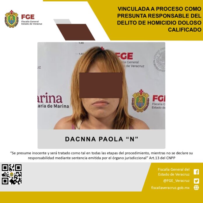 Coatzacoalcos, Ver., 17 de octubre de 2025.- La Fiscalía Regional Coatzacoalcos obtuvo vinculación a proceso en contra de Dacnna Paola “N” como presunta responsable del delito de homicidio doloso calificado en agravio de las víctimas identificadas con las iniciales A.A.M.V., C.L.L.C. y una persona hasta el momento no identificada.