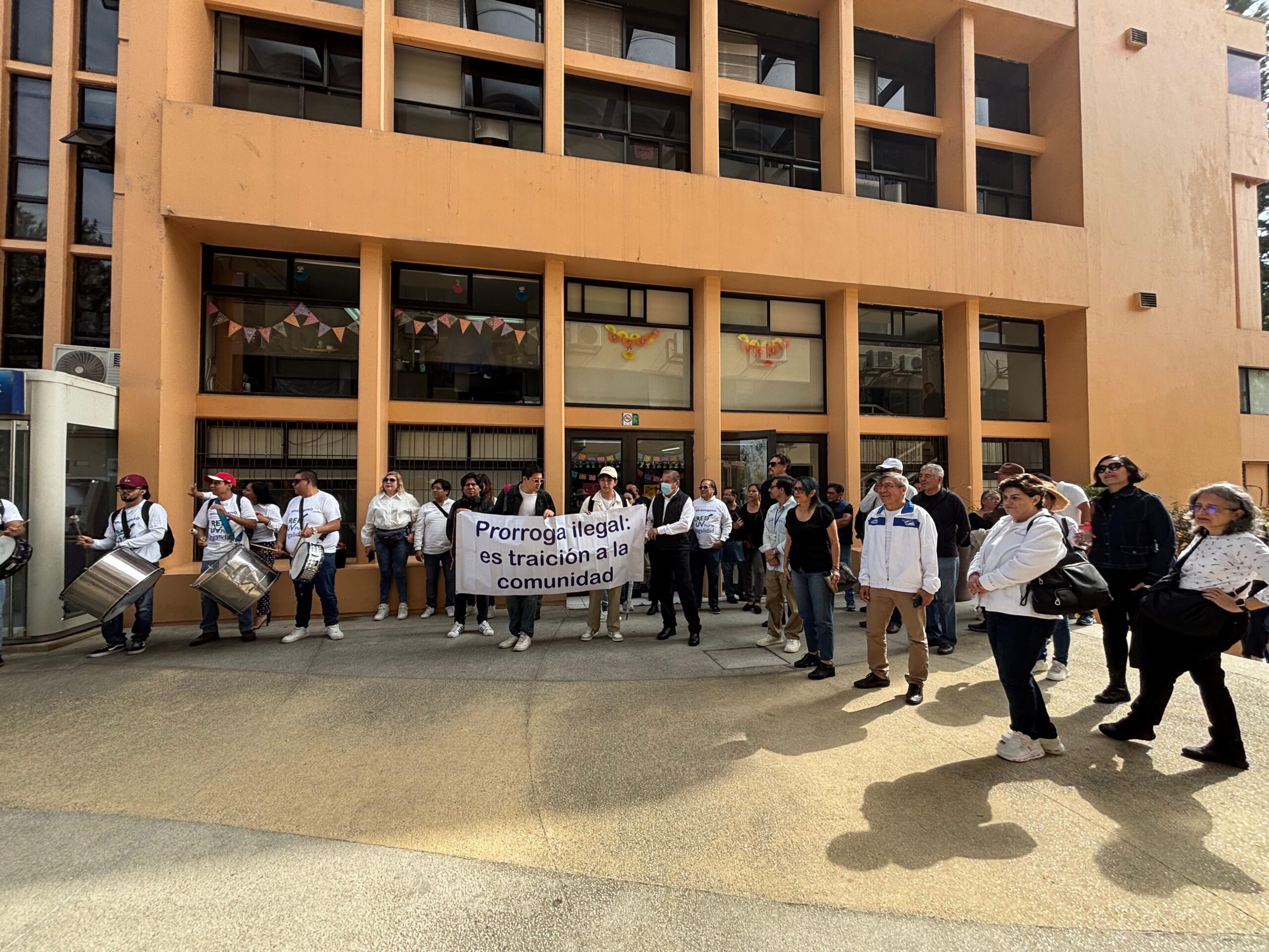 Con batucada y lonas, los integrantes de la Red UV por la Legalidad se plantaron frente al edificio de la Rectoría, donde se leían mensajes como: “Prórroga ilegal: es traición a la comunidad” y “¡Alza tu voz #PrórrogaNO”.
