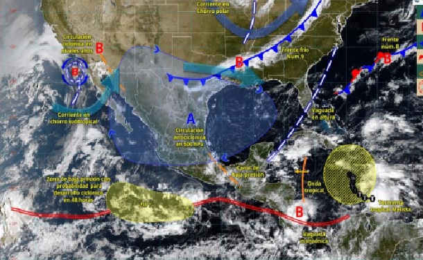 montañosas, y durante la noche y madrugada en planicies y zonas de costa, con la actividad más importante en el sur, y con una disminución gradual del potencial de lluvias hacia el día viernes, derivado de la influencia del anticiclón en niveles medios, previendo lluvias fuertes (25 a 50 mm) a puntuales muy fuertes (50 a 75 mm) en las cuencas del Papaloapan, Coatzacoalcos y Tonalá, entre los días miércoles y jueves, y con presencia de chubascos (5.1 a 25 mm) el día viernes.