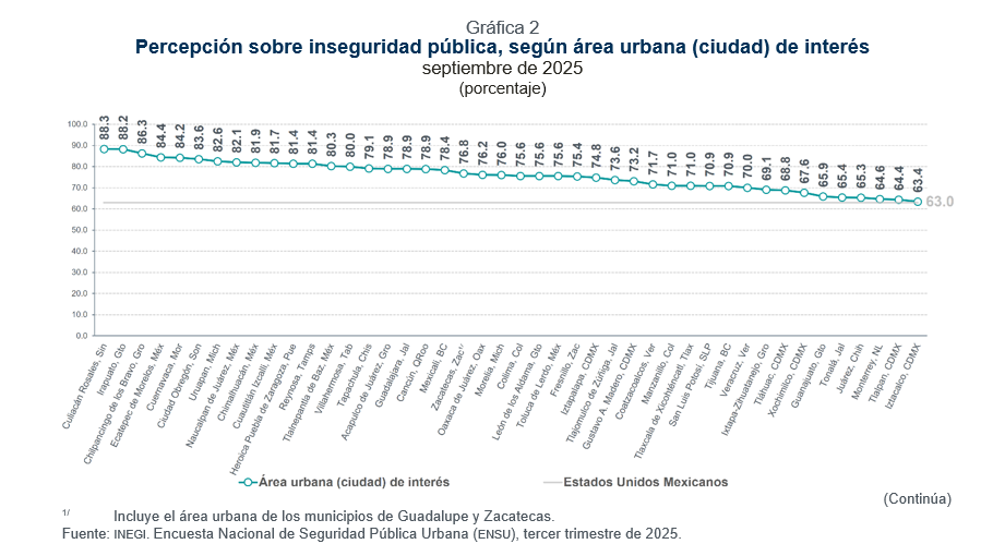 En septiembre de 2025, 30.3 % de la población de 18 años y más consideró que el gobierno de su ciudad era muy o algo efectivo para resolver los problemas más recurrentes. Las áreas urbanas de interés donde se percibió mayor efectividad fueron Piedras Negras (71.6 %), San Pedro Garza García (69.9 %) y Apodaca (60.7 %). Por otro lado, las áreas urbanas de interés donde resultó menor esta percepción fueron Cuautitlán Izcalli (8.6 %), Coatzacoalcos (11.1 %) y Chimalhuacán (12.3 %), informó el INEGI al presentar los resultados de la Encuesta Nacional de Seguridad Pública Urbana (ENSU) que corresponden al tercer trimestre de 2025.
