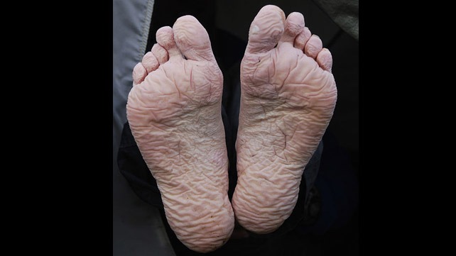 Entre los síntomas que se pueden presentar destacan: enrojecimiento o palidez de la piel sumergida en agua, sensación de hormigueo o ardor, así como dolor intenso y ampollas, descamación o heridas abiertas en la piel.