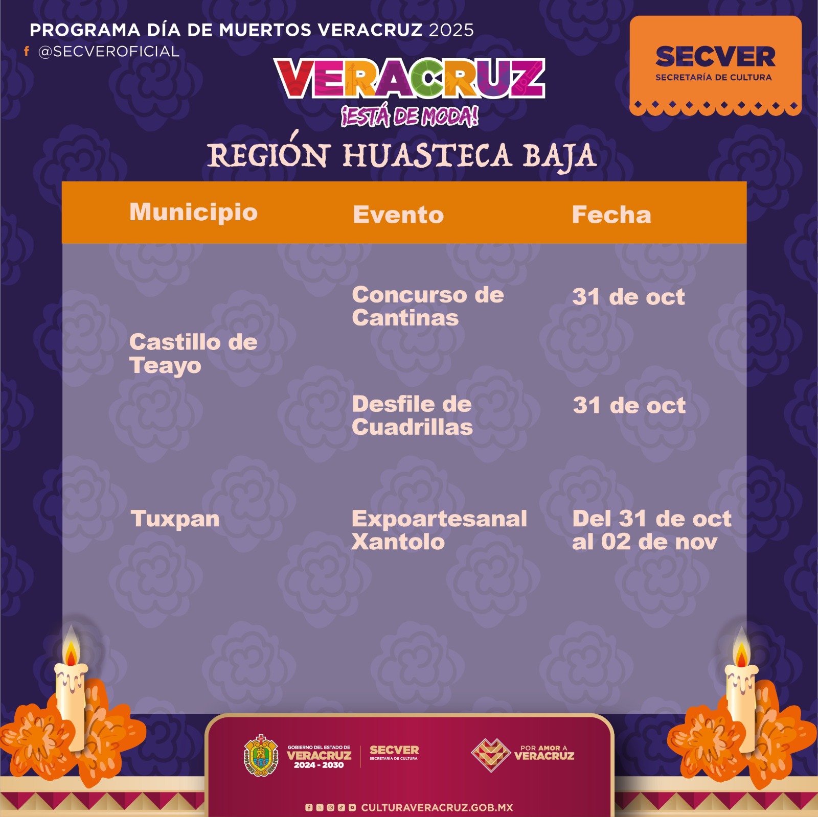 Xalapa, Ver., sábado 25 de octubre de 2025.- La Secretaría de Cultura de Veracruz (SECVER) invita a participar en las actividades conmemorativas con motivo de la celebración de Día de Muertos, que se realizarán en las Huastecas Alta y Baja.