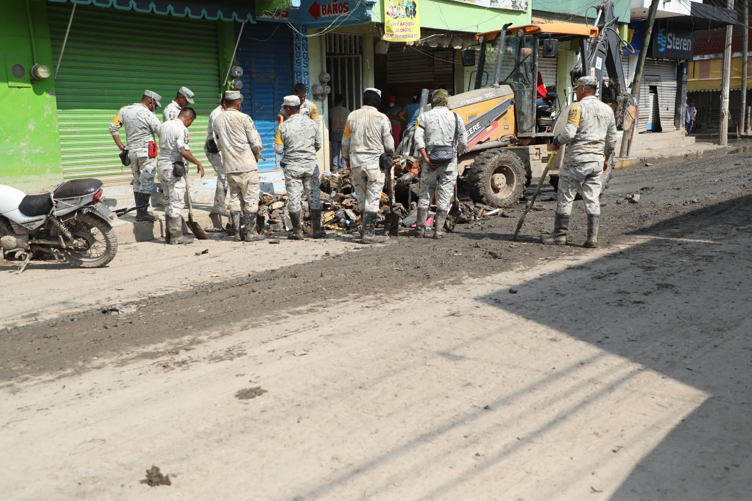Se ha desplegado un número significativo de efectivos, intensificando las labores en las áreas más golpeadas por el desbordamiento de ríos, utilizando maquinaria pesada para agilizar el retiro de material que obstruye las calles.