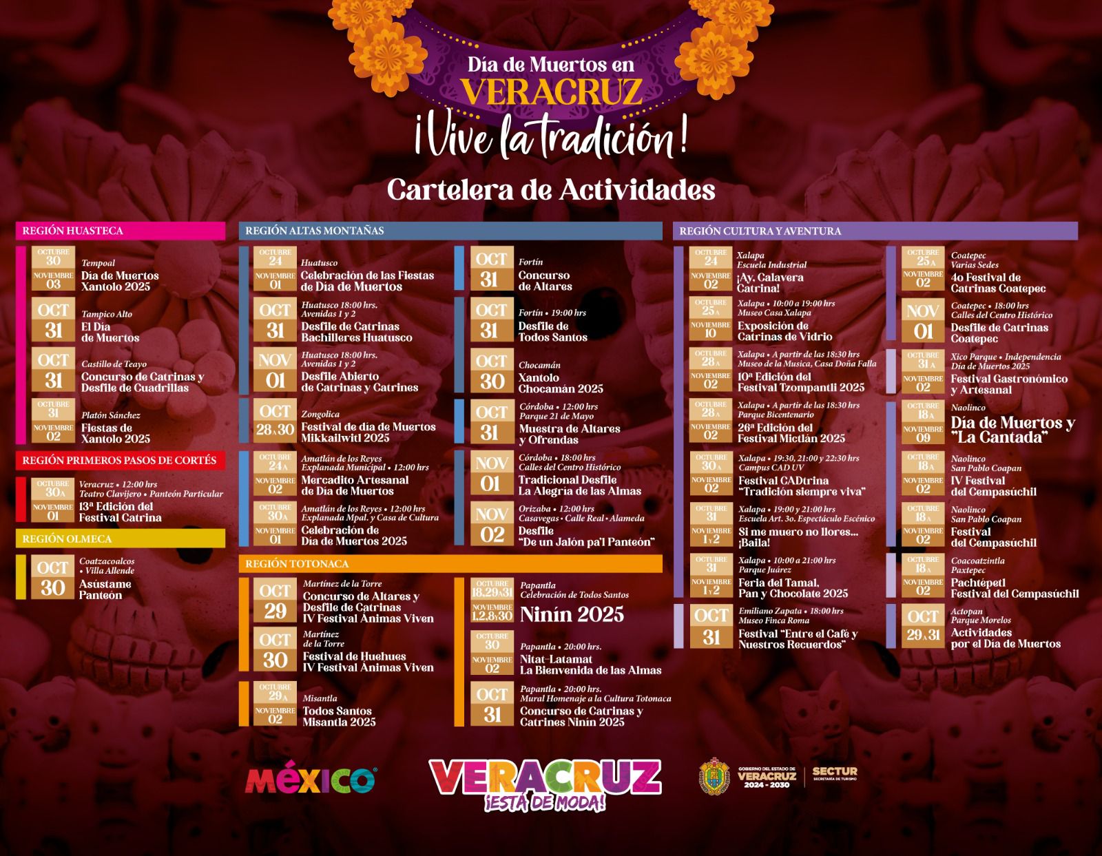 Xalapa, Ver., miércoles 29 de octubre de 2025.- Veracruz, a través de la Secretaría de Turismo (SECTUR), te invita a celebrar la tradición del Día de Muertos y disfrutar estas fechas en sus regiones turísticas, con festivales y la gastronomía que refleja la identidad de su pueblo.