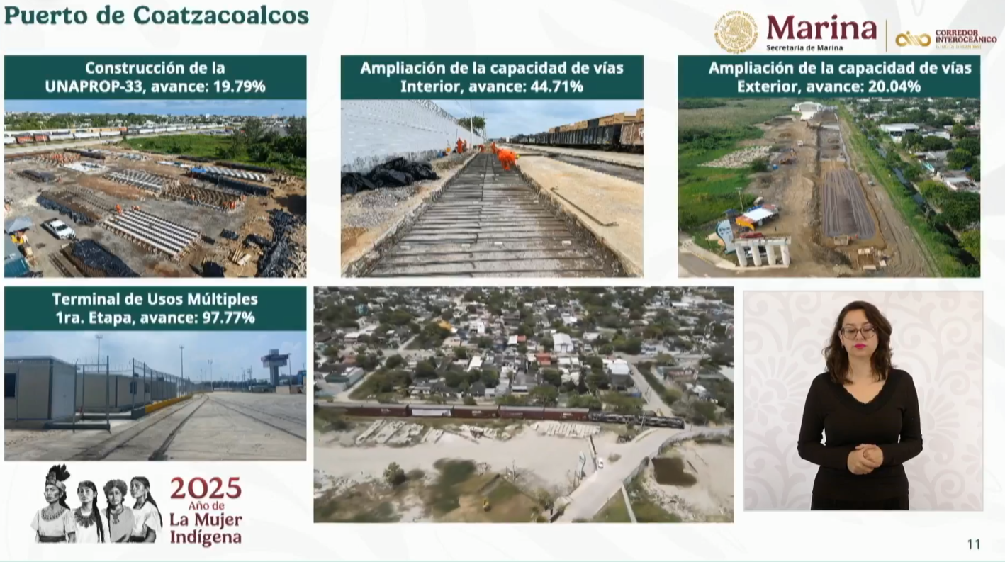 En su informe, Sánchez Guillén detalló que en Coatzacoalcos, la ASIPONA construye la Unidad de Protección Marítima y Portuaria, que presenta 19.7% de avance. De forma paralela, se amplían los patios férreos con dos frentes de obra que registran 44.7% y 20% de progreso, respectivamente, con conclusión programada para abril de 2026.
