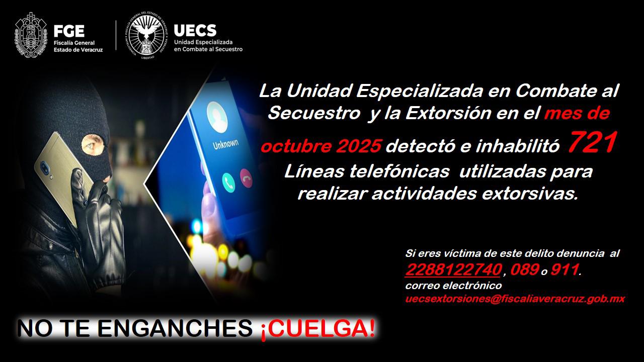 Xalapa, Ver., 3 de noviembre del 2025.-La Unidad Especializada en Combate al Secuestro y la Extorsión logró inhabilitar 721 líneas telefónicas durante el mes de octubre del presente año. Estas líneas eran utilizadas por delincuentes para cometer extorsiones en la entidad.