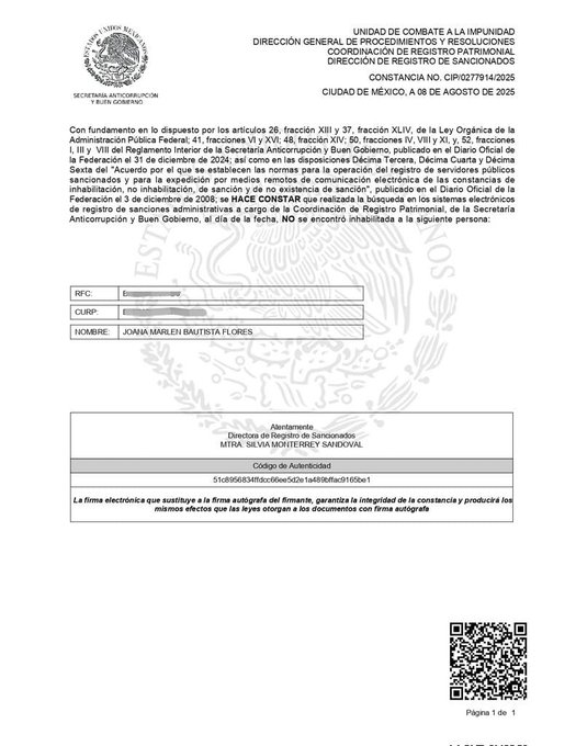 Constancia No. CIP0277914I2025 de ámbito federal, fechada 08 de agosto de 2025, emitida por la Dirección de Registro de Sancionados (Unidad de Combate a la Impunidad), que hace constar que no se encontró inhabilitación vigente a su nombre, firmada por Mitra Selva Monterrey Sandoval.