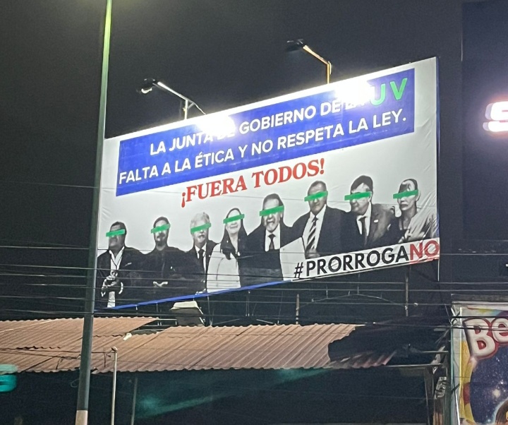 Los mensajes, ubicados en puntos estratégicos de alta visibilidad, como la avenida 20 de Noviembre, exhiben las fotografías de los integrantes de la Junta de Gobierno con los ojos cubiertos por una franja verde, junto a la contundente leyenda: “La junta de Gobierno de la UV falta a la ética y no respeta la Ley, ¡fuera todos!”.