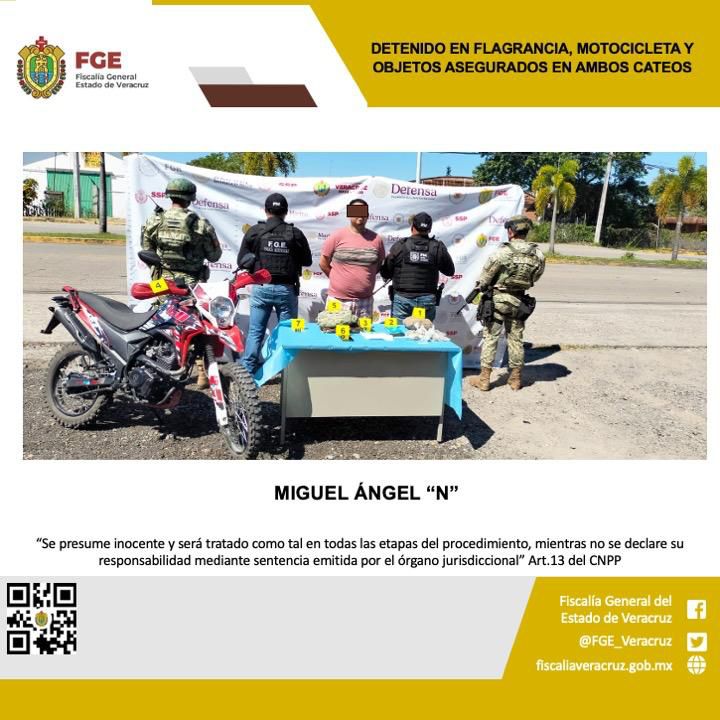 En el segundo cateo, llevado a cabo en la colonia Alfredo V Bonilla del municipio de Martínez de la Torre, se logró la detención en flagrancia de Miguel Ángel “N” y el aseguramiento de hierba seca con características similares a las de la marihuana, una sustancia con características similares a las del cristal, una libreta y un celular.