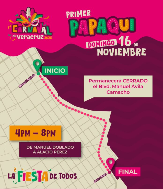 Veracruz, Ver., 13 de noviembre de 2024.– Todo se encuentra listo para celebrar el primer papaqui del Carnaval de Veracruz 2026, la fiesta de todos, este domingo 16 de noviembre, a partir de las 18:00 horas, en el bulevar Manuel Ávila Camacho.