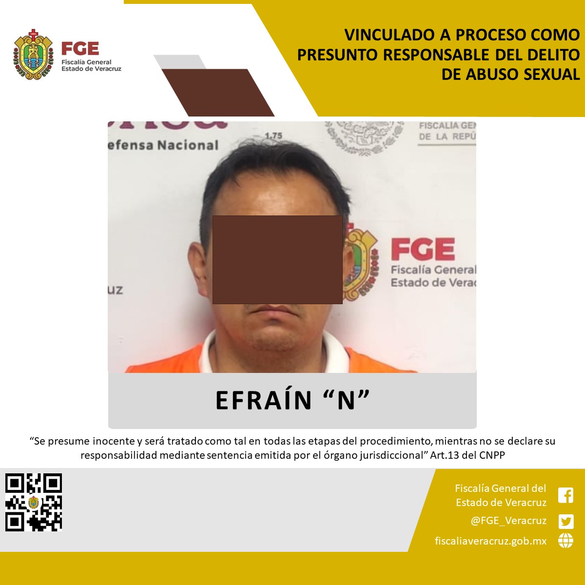 Orizaba, Ver., 26 de noviembre del 2025.- La Fiscalía Coordinadora Especializada en Delitos contra las Mujeres, Feminicidio, Familia y Trata de Personas obtuvo vinculación a proceso en contra de Efraín “N” como presunto responsable del delito de abuso sexual, cometido en agravio de una víctima de identidad resguardada.