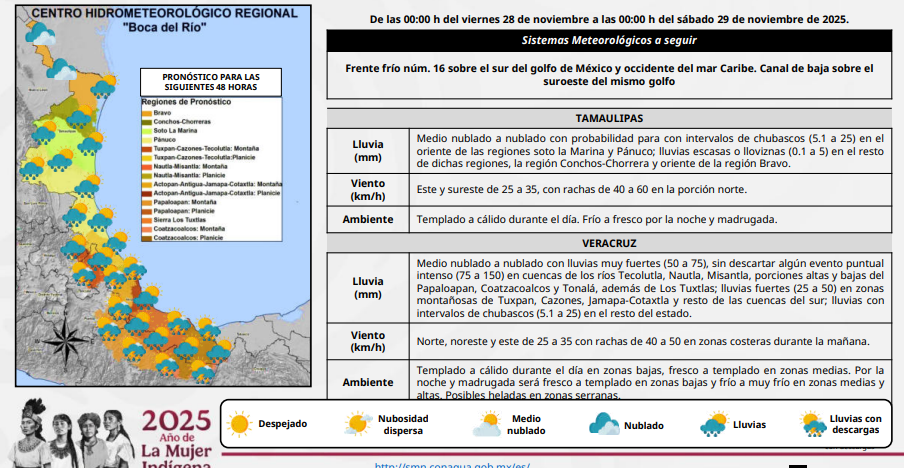 Durante el día viernes el frente frío núm. 16 se desplazará sobre el occidente del mar Caribe, mientras que, frente a las costas del sur de Veracruz continuará posicionado un canal de baja presión; para el sábado se prevé el restablecimiento de una circulación anticiclónica sobre el mencionado golfo; para el domingo se prevé el desplazamiento de un nuevo sistema frontal sobre el noreste del territorio nacional y noroeste del golfo de México.