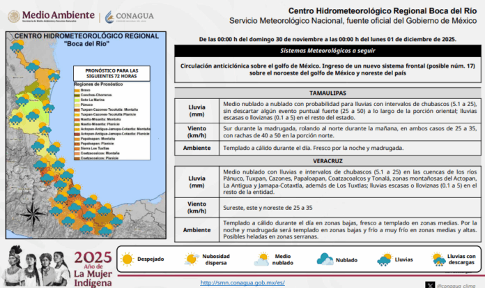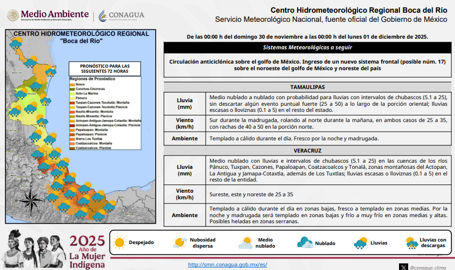 Para Veracruz, se esperan condiciones de medio nublado con lluvias e intervalos de chubascos (5.1 a 25) en las cuencas de los ríos Pánuco, Tuxpan, Cazones, Papaloapan, Coatzacoalcos y Tonalá; en las zonas montañosas del Actopan, La Antigua y Jamapa-Cotaxtla, además de Los Tuxtlas; y lluvias escasas o lloviznas (0.1 a 5) en el resto de la entidad.