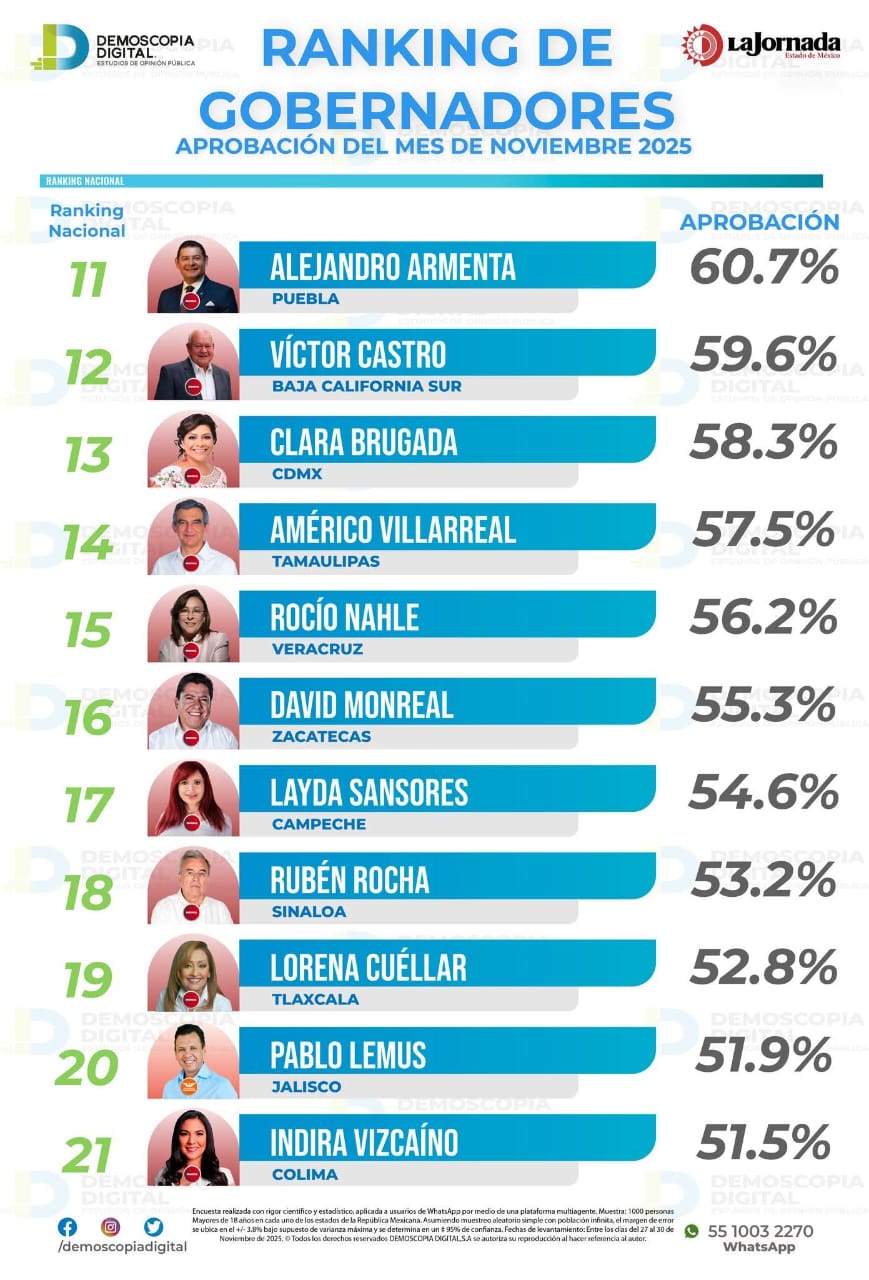 Por eso, la posición de Rocío Nahle en el ranking nacional no es un dato aislado: es el reflejo del rumbo que hoy tiene Veracruz conducido por una mujer preparada, firme y comprometida con el bienestar del estado