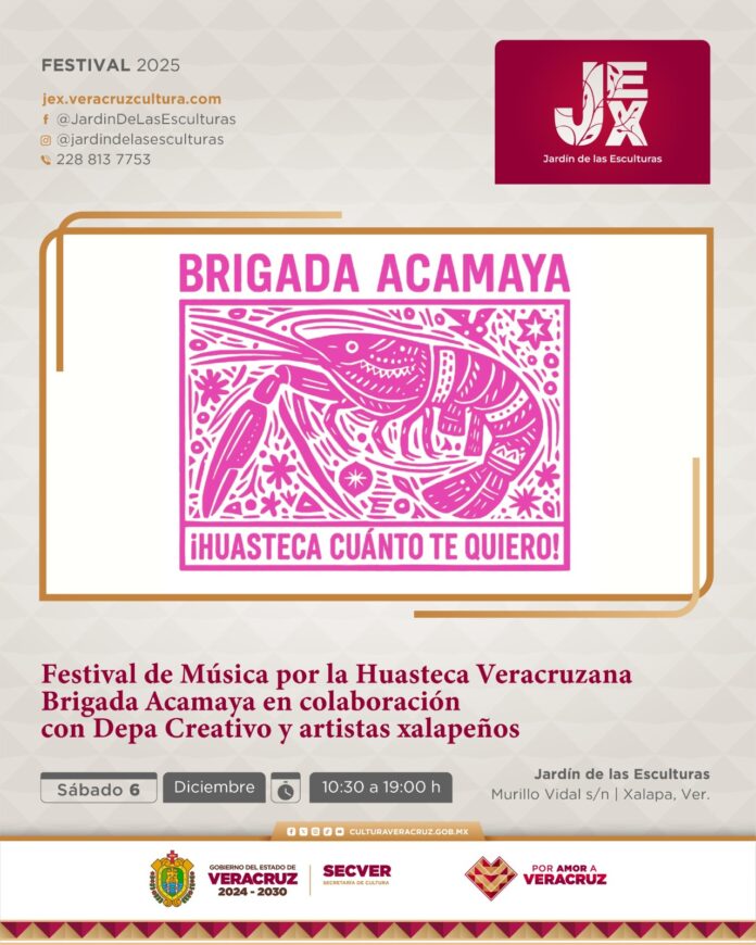 Xalapa, Ver., jueves 04 de diciembre de 2025.- La Brigada Acamaya, el Colectivo Bugambilia y el Depa Creativo invitan al público al Festival de Música por la Huasteca, que se llevará a cabo el día sábado 6 de diciembre en la explanada del Jardín de las Esculturas de Xalapa (JEX), recinto de la Secretaría de Cultura de Veracruz (SECVER), de 10:30 a 19:00 horas.