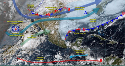 La Comisión Nacional del Agua (Conagua) prevé que el frente frío núm. 17 se mantenga en el norte del golfo de México durante este periodo y sea reforzado por una nueva masa de aire frío, interaccionando con una vaguada en el suroeste del mismo golfo.