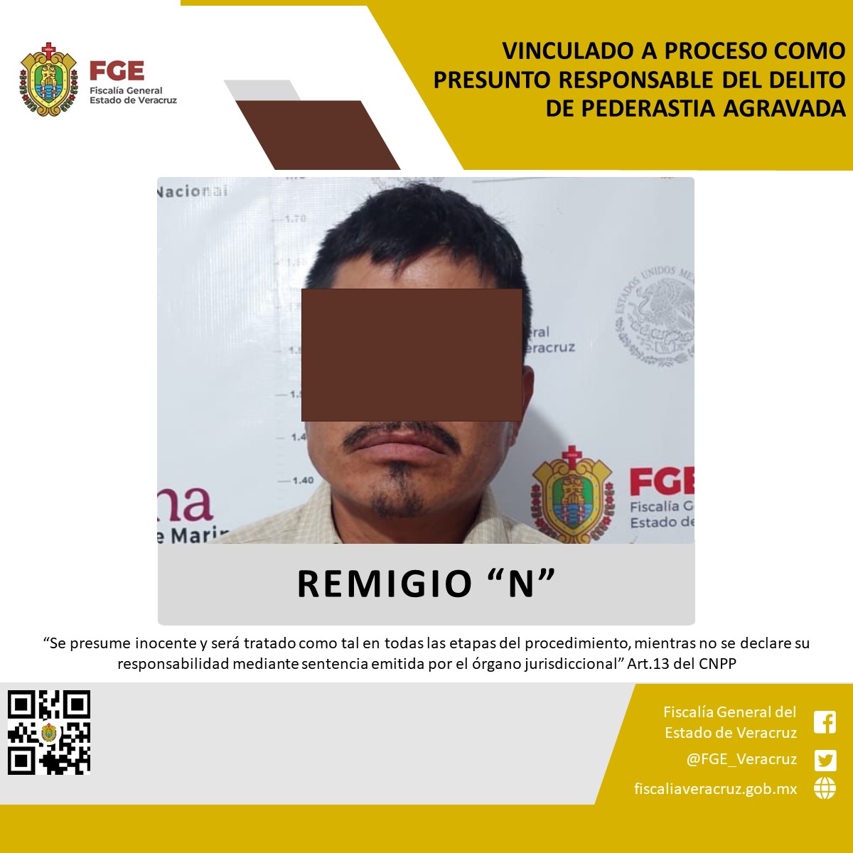 Huayacocotla, Ver., 4 de diciembre del 2025.- La Fiscalía Coordinadora Especializada en Delitos contra las Mujeres, Feminicidio, Familia y Trata de Personas obtuvo vinculación a proceso en contra de Remigio “N” como presunto responsable del delito de pederastia agravada, cometido agravio de una víctima con identidad resguardada.