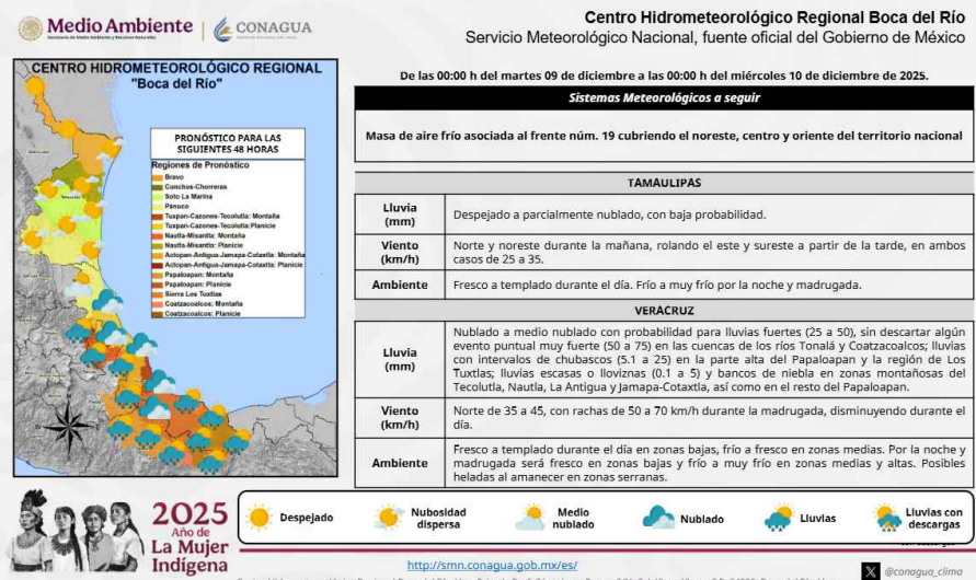 Para las próximas horas, la Comisión Nacional del Agua -Servicio Meteorológico Nacional- pronostica para Veracruz cielo nublado a medio nublado con probabilidad de lluvias fuertes (25 a 50), sin descartar algún evento puntual muy fuerte (50 a 75) en las cuencas de los ríos Tonalá y Coatzacoalcos; lluvias con intervalos de chubascos (5.1 a 25) en la parte alta del Papaloapan y la región de Los Tuxtlas; y lluvias escasas o lloviznas y bancos de niebla en las zonas montañosas del Tecolutla, Nautla, La Antigua y Jamapa-Cotaxtla.