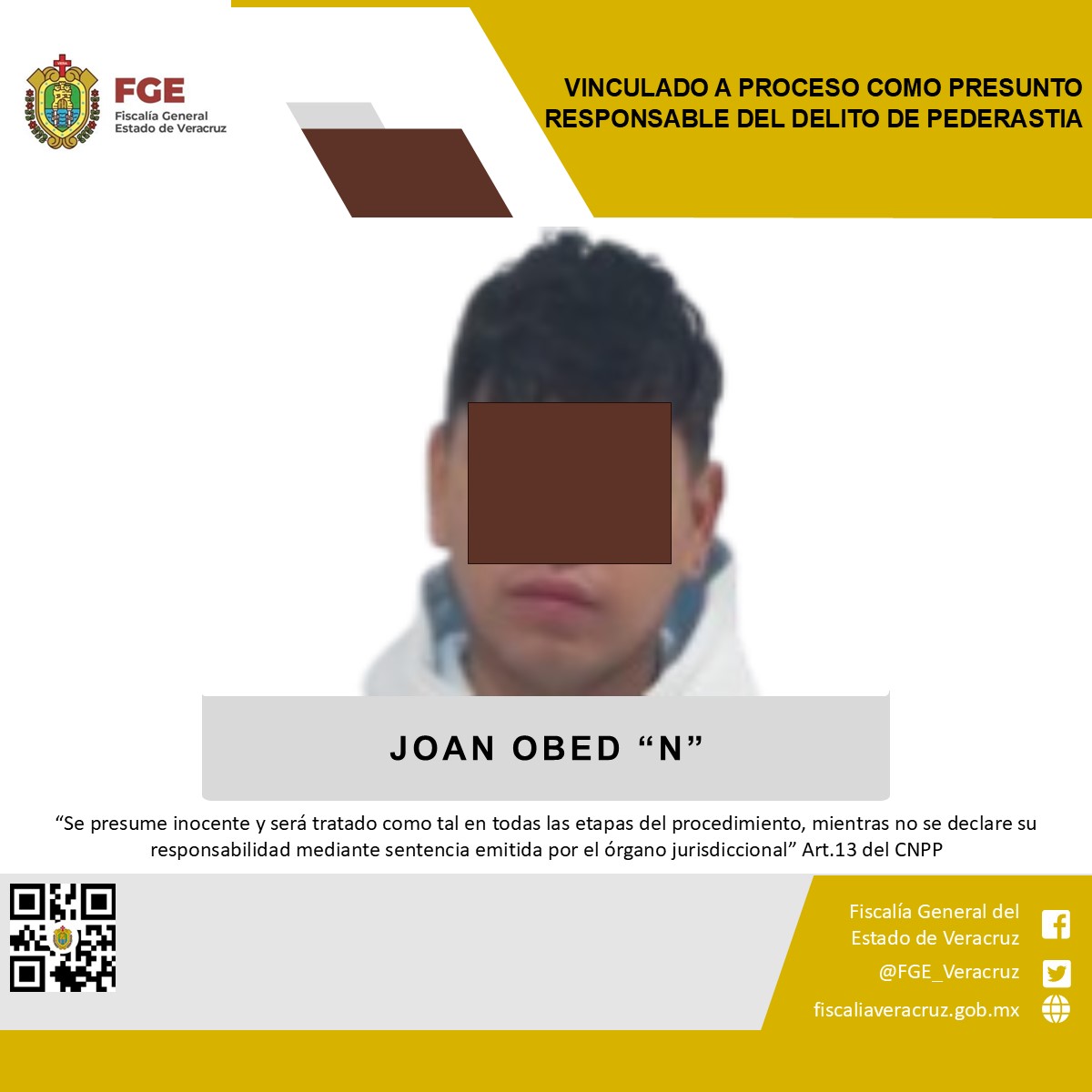 Córdoba, Ver., 16 de diciembre 2025.- La Fiscalía Coordinadora Especializada en Delitos contra las Mujeres, Feminicidio, Familia y Trata de Personas obtuvo vinculación a proceso en contra de Joan Obed “N” como presunto responsable del delito de pederastia, cometido en agravio de una víctima menor de edad con identidad resguardada.