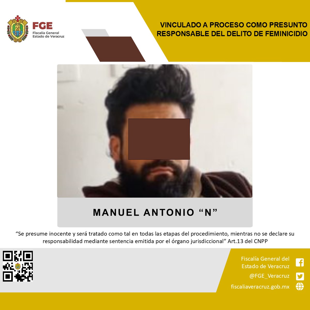 Veracruz, Ver., 17 de diciembre 2025.- La Fiscalía Coordinadora Especializada en Delitos contra las Mujeres, Feminicidio, Familia y Trata de Personas obtuvo vinculación a proceso en contra de Manuel Antonio “N” como presunto responsable del delito de feminicidio.