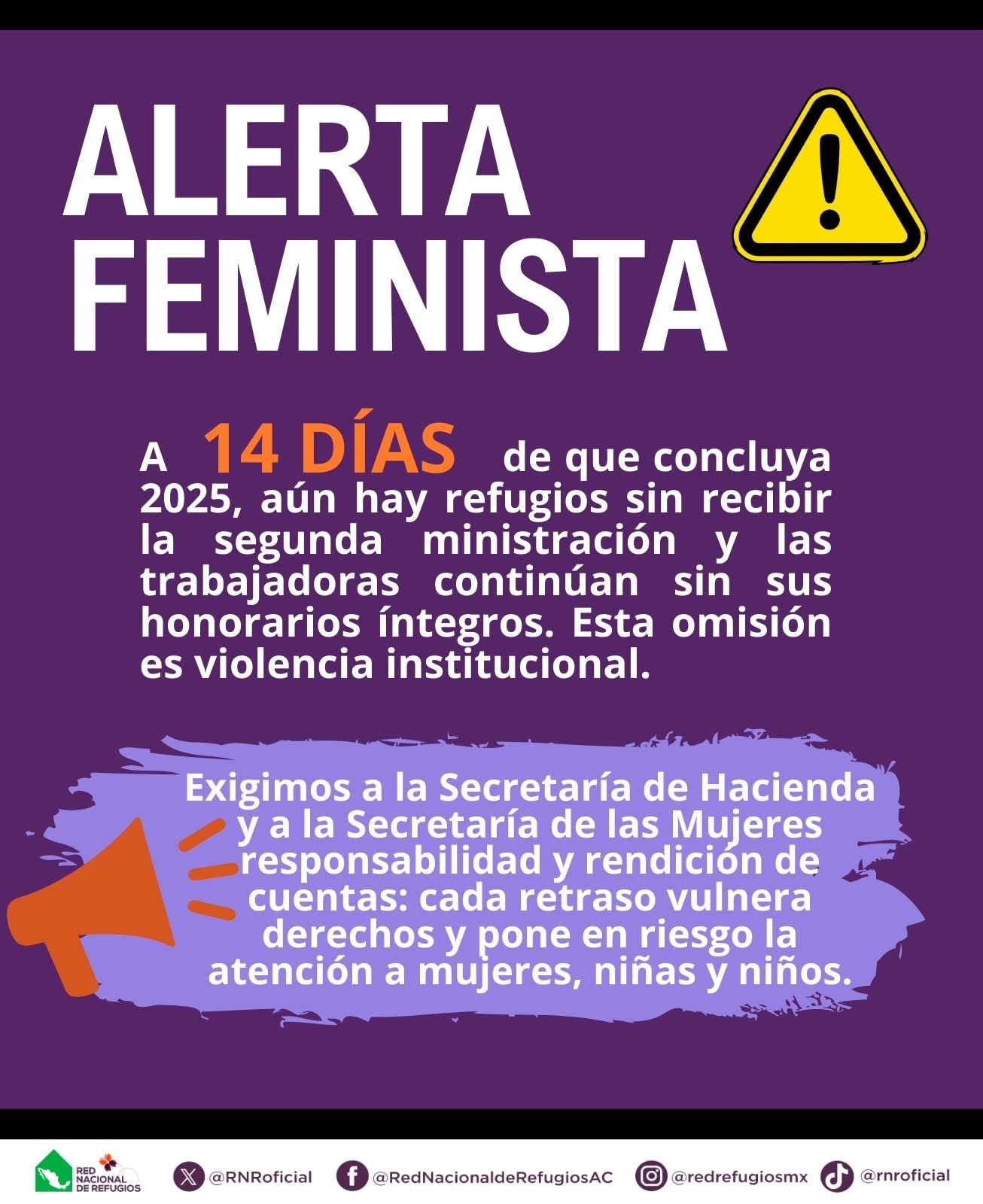 Ante la gravedad del panorama, la Red Nacional de Refugios dirigió una exigencia directa a la Secretaría de Hacienda y a la Secretaría de las Mujeres para que asuman su responsabilidad y rindan cuentas sobre la retención de estos fondos.