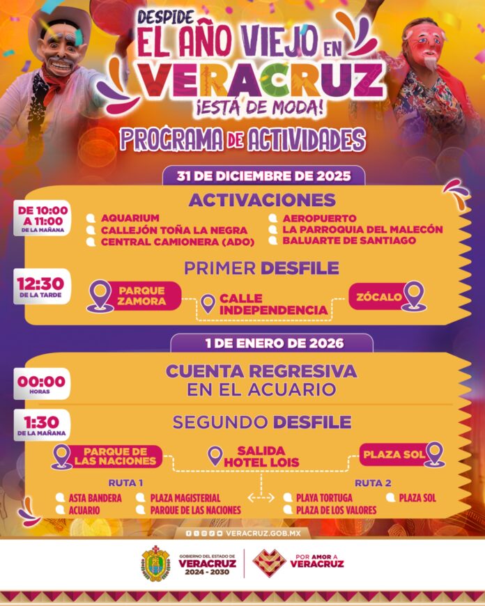 Xalapa, Ver., martes 30 de diciembre de 2025.- La Secretaría de Cultura de Veracruz (SECVER) invita a la ciudadanía y a visitantes nacionales y extranjeros a las actividades culturales y artísticas programadas para Despide el Año Viejo en Veracruz, una jornada que este miércoles 31 de diciembre transformará espacios emblemáticos del puerto de Veracruz en escenarios de convivencia, identidad y celebración.