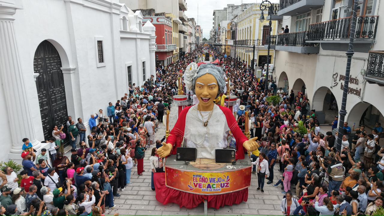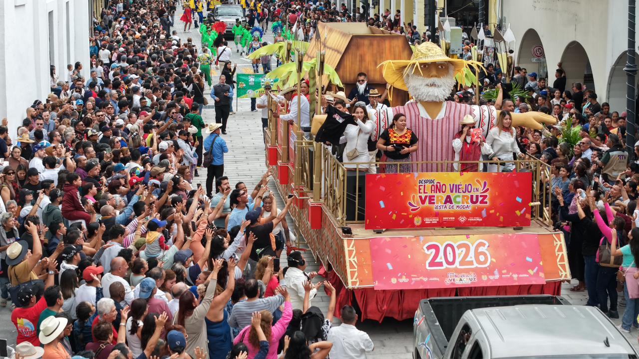 Veracruz, Ver., miércoles 31 de diciembre de 2025.- Entre la algarabía que caracteriza al pueblo jarocho y en la tierra que dio origen a la tradición de El Viejo, dio inicio el primer desfile Despide el Año Viejo en Veracruz, encabezado por una de las tres figuras monumentales que conformaron el contingente.