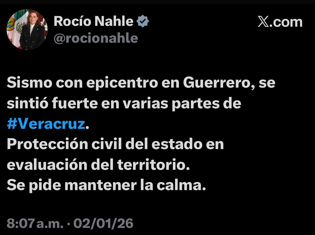 A través de un mensaje difundido en redes sociales, la mandataria estatal señaló que el movimiento telúrico fue sentido de manera fuerte en varias zonas del territorio veracruzano, por lo que de inmediato se activaron los protocolos de revisión correspondientes.