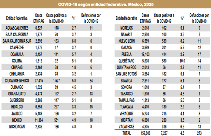 Al corte de la semana epidemiológica número 52 de 2025, la Secretaría de Salud del Gobierno Federal informó que se han confirmado en México 7,237 casos positivos a Covid-19.