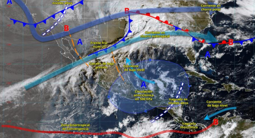 Al paso de dicho sistema frontal y de la interacción que tendrá con un canal de baja presión que se posicionará sobre el suroeste del golfo de México se prevé el incremento de nublados y la probabilidad para lluvias muy fuertes (50 a 75 mm) a intensas (75 a 150 mm) en zonas montañosas de las cuencas de los ríos Tecolutla, Nautla, Misantla y Papaloapan, así como dentro del Coatzacoalcos y Tonalá además de los Tuxtlas, en donde no se descartan eventos puntuales torrenciales (150 a 250 mm) en las últimas dos regiones especialmente el domingo; lluvias con intervalos de chubascos (5.1 a 25 mm) y eventos puntuales fuertes (25 a 50 mm) en zonas montañosas desde la cuenca del Pánuco hasta el Jamapa-Cotaxtla.