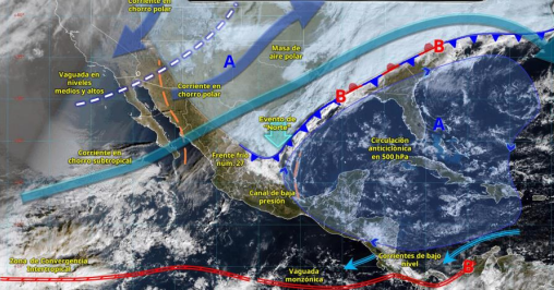 Por su parte, la masa de aire fría asociada cubrirá el norte, centro y oriente del territorio nacional durante la mayor parte del periodo de pronóstico, así como también la persistencia de un canal de baja presión sobre el occidente y suroeste del mencionado golfo.