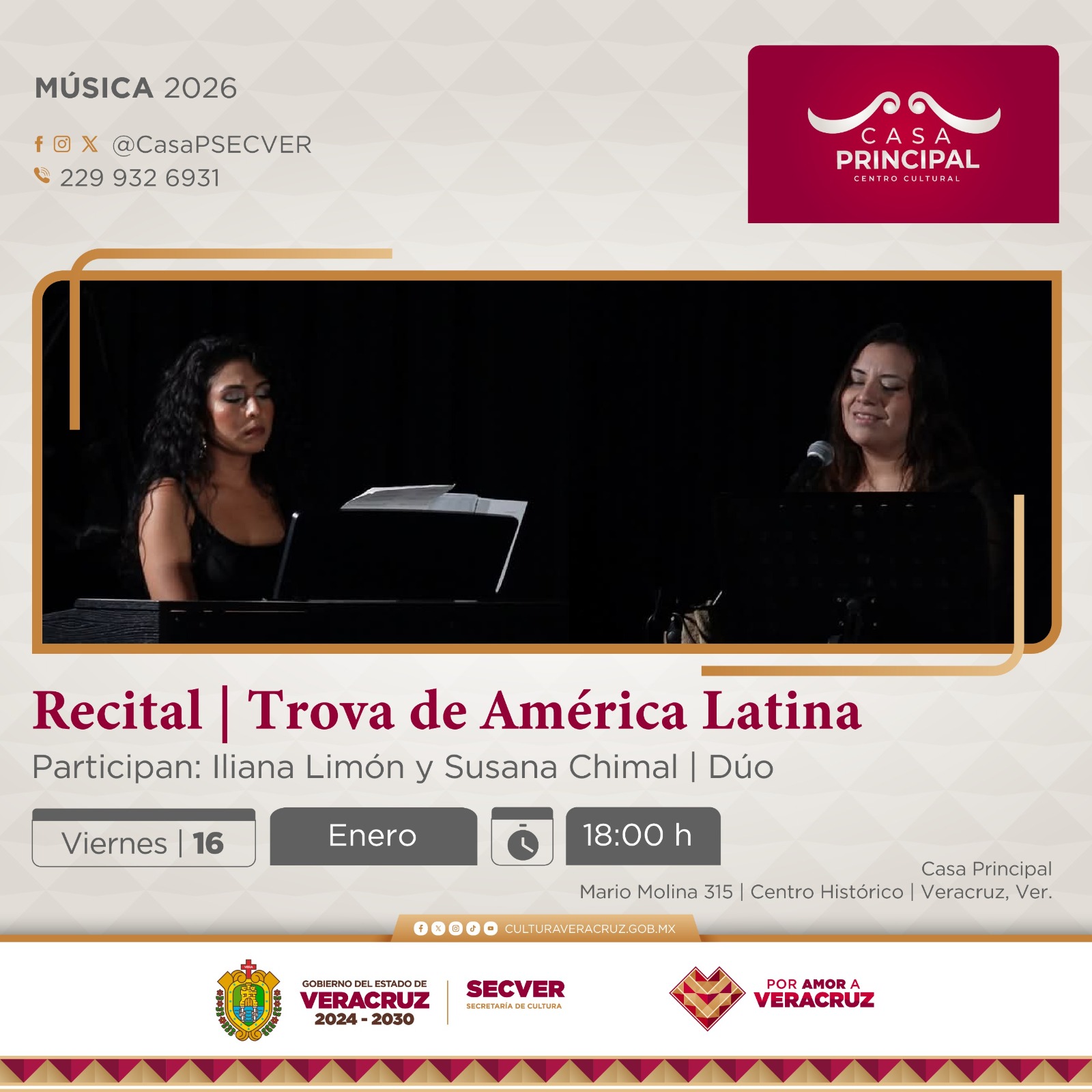 Trova de América Latina es el primero, con la participación especial del dúo formado por Iliana Limón y Susana Chimal. Este evento musical propone un recorrido por la trova y la canción latinoamericana como una forma de poesía cantada, donde la música se convierte en un puente de diálogo con la comunidad.