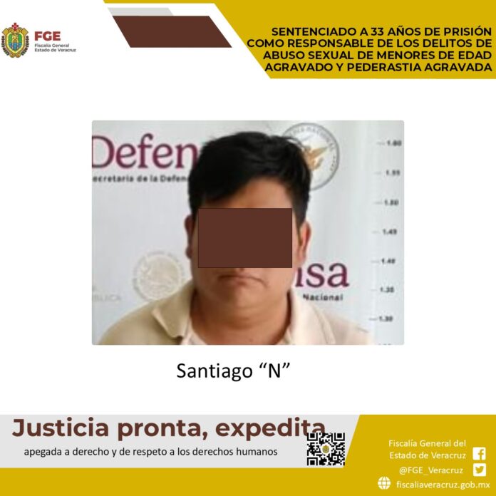 Jalacingo, Ver., a 14 de enero del 2026.- La Fiscalía General del Estado informa que, la Fiscalía Coordinadora Especializada en Delitos contra las Mujeres, Feminicidio, Familia y Trata de Personas obtuvo una sentencia condenatoria de 33 años de prisión en contra de Santiago “N”, como penalmente responsable de los delitos de abuso sexual de menores de edad agravado y pederastia agravada.