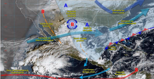 La Comisión Nacional del Agua (Conagua) informó que en el transcurso de la tarde del miércoles un frente frío se acercará al norte de Tamaulipas con tendencia a ingresar en el Golfo de México y recorrerlo durante el jueves, mientras que la masa de aire frío que se le asocia escurre por la vertiente oriental del país interactuando con el canal de baja presión en el suroeste del mismo Golfo; condición que favorecerá se mantenga cielo medio nublado a nubado en la entidad veracruzana, mientras que en la entidad tamaulipeca favorecerá cielo despejado; previendo el restablecimiento de la circulación anticiclónica a partir del viernes.