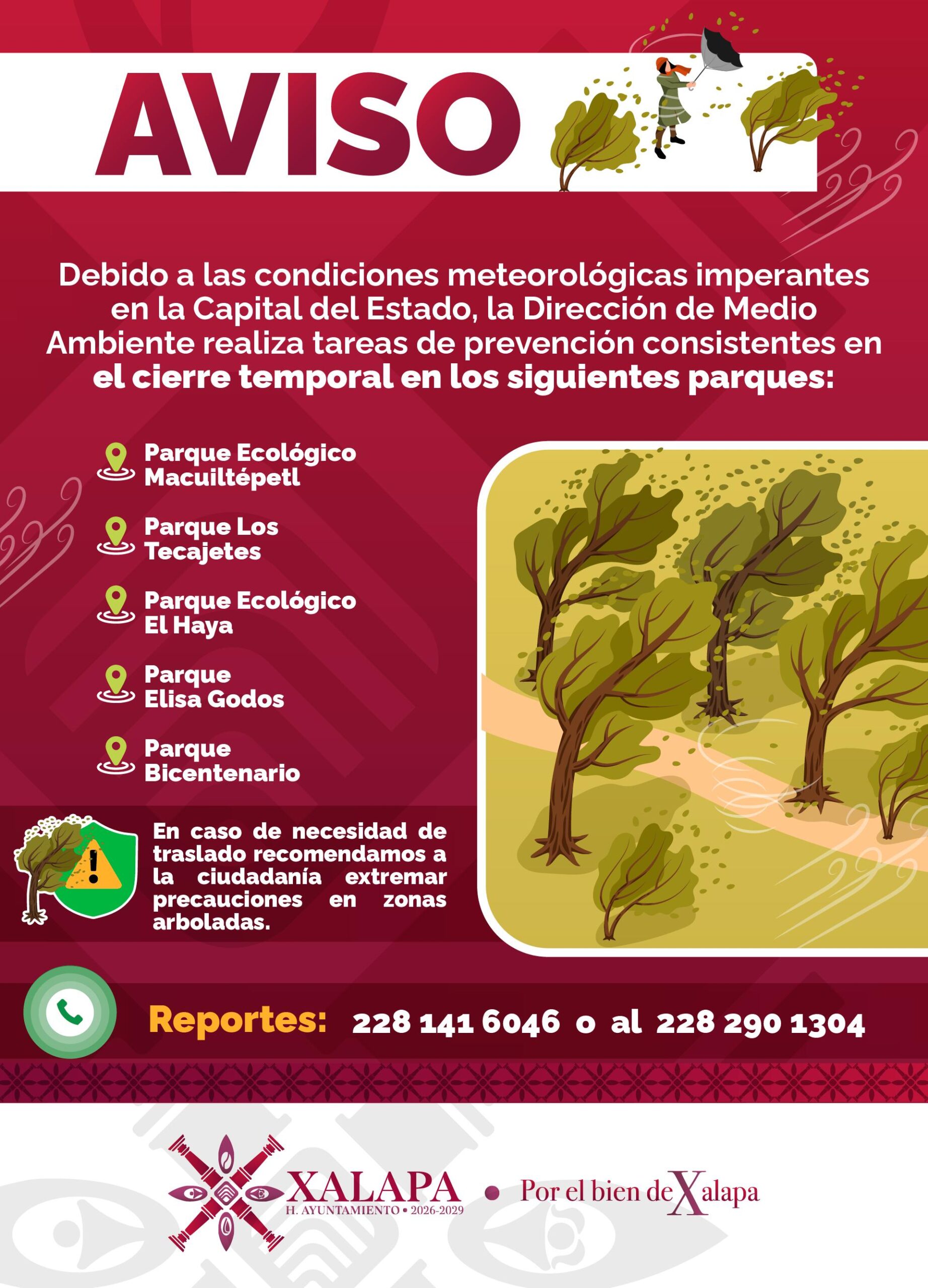 Debido a las condiciones meteorológicas imperantes en la capital del estado, el Ayuntamiento de Xalapa, a través de la Dirección de Medio Ambiente, implementó medidas preventivas que incluyen el cierre temporal de diversos parques públicos, con el objetivo de salvaguardar la integridad de la ciudadanía.