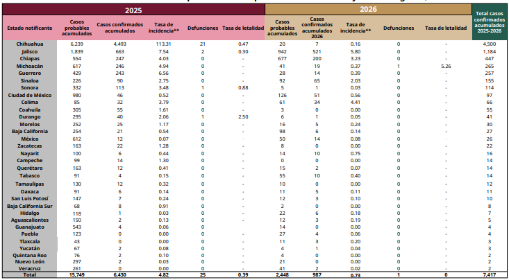 En la actualización del informe diario, la fuente dio a conocer que contrario a lo ocurrido en 2025, cuando no se reportaron casos en la entidad, en los primeros días del presente año se confirmaron dos contagios.