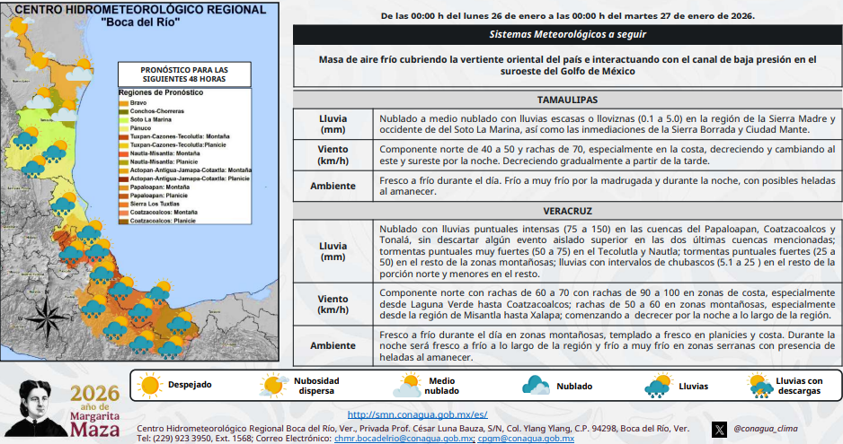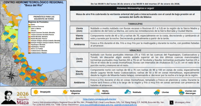 Durante este periodo se mantendrá la interacción de la masa de aire frío sobre Tamaulipas y Veracruz con el canal de baja presión en el suroeste del Golfo de México, ocasionando condiciones de cielo medio nublado a nublado con presencia de lluvias en ambas entidades.