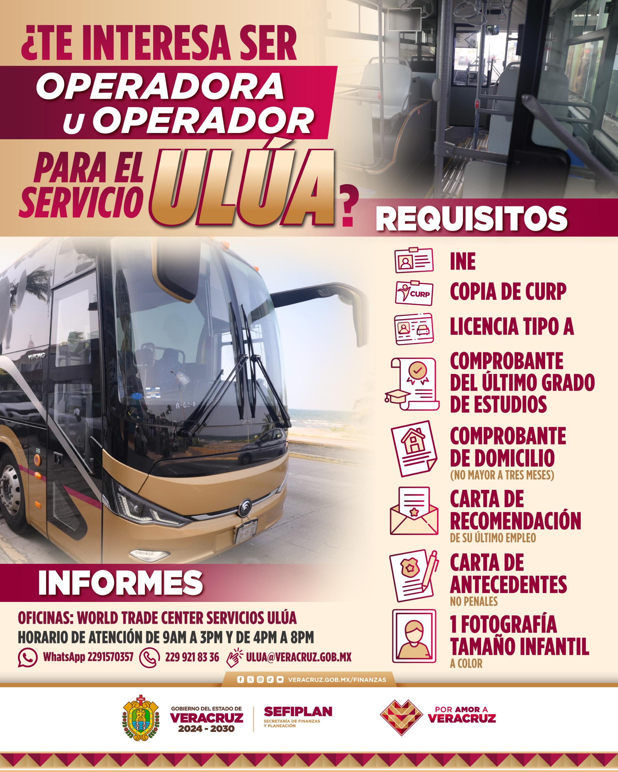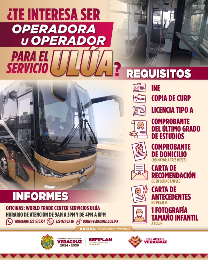 Veracruz, Ver.— El Gobierno del Estado de Veracruz, a través de la Secretaría de Finanzas y Planeación (Sefiplan), mantiene abierta la convocatoria para personas interesadas en integrarse como operadoras u operadores del servicio de transporte Ulúa, con el objetivo de fortalecer la operación de este sistema de movilidad en la zona conurbada.