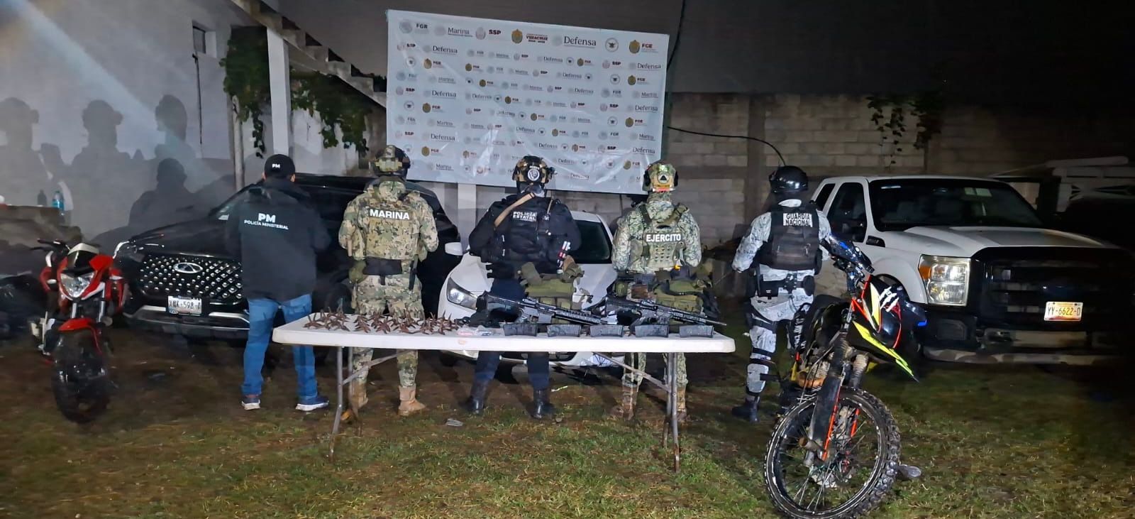 En apoyo a la Fiscalía General del Estado, durante cateos en Papantla, Huayacocotla, Tihuatlán, Veracruz, Altotonga, Tezonapa, Oluta y Minatitlán, fueron aprehendidas cuatro personas, asegurándose 20 dosis y una bolsita de una sustancia con características del cristal, así como 24 dosis, una bolsita y un cigarro de hierba seca similar a la marihuana; cinco armas de fuego largas y una réplica, cargadores, cartuchos útiles, armas blancas y dinero en efectivo.