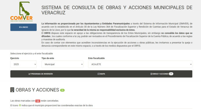 En su portal del Órgano de Fiscalización Superior (ORFIS), hay un apartado, denominado Sistema de Consulta de Obras y Acciones Municipales de Veracruz, en el que usted podrá revisar cómo dispondrá de los recursos su autoridad municipal, aunque aún, por obvias razones, no ha sido actualizado.