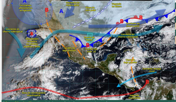 Al paso del sistema frontal y su interacción con un canal de baja presión que se entenderá sobre el sureste del golfo de México, ocasionarán el incremento de nublados con probabilidad para lluvias puntuales muy fuertes (50 a 75 mm), sin descartar algún evento puntual intenso (75 a 150 mm) en las cuencas de los ríos Tonalá, Coatzacoalcos y parte alta del Papaloapan, además de Los Tuxtlas; lluvias con intervalos de chubascos (5.1 a 25 mm) en zonas montañosas desde la cuenca del río Tecolutla hasta el Jamapa-Cotaxtla; lluvias escasas o lloviznas (0.1 a 5 mm) en el resto de la entidad veracruzana. Posibilidad de caída de nieve o aguanieve en zonas del Cofre de Perote y Pico de Orizaba especialmente el jueves.