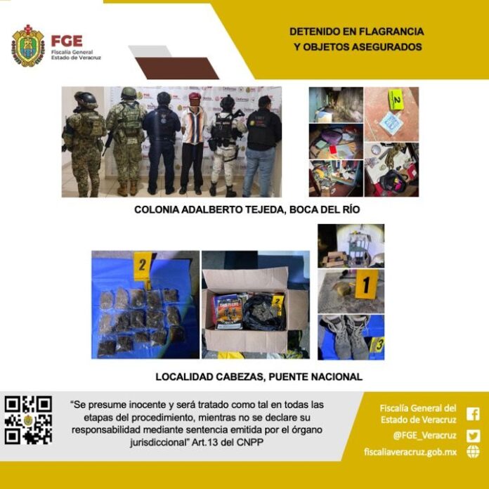 En el primer punto, ubicado en la colonia Adalberto Tejeda del municipio de Boca del Río, se detuvo en flagrancia a Alfonso “N”, a quien se le aseguró hierba verde seca con características similares a la marihuana, vapeadores, bolsas plásticas con una leyenda alusiva a un grupo delictivo, una sustancia con características similares al cristal y un arma blanca.