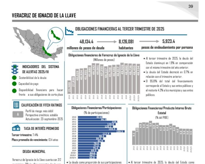 El reporte del IBD destaca básicamente tres puntos con respecto a Veracruz: primero, al tercer trimestre de 2025, ya durante el gobierno de Rocío Nahle, la deuda del Estado disminuyó en 1.9% en comparación con el mismo trimestre del año anterior; segundo, la deuda de Veracruz decreció en 0.7% en relación con el trimestre anterior; y tercero, el 95.8% del total del financiamiento corresponde al Estado y sus entes públicos y el restante 4.2% a los municipios y sus entes públicos.
