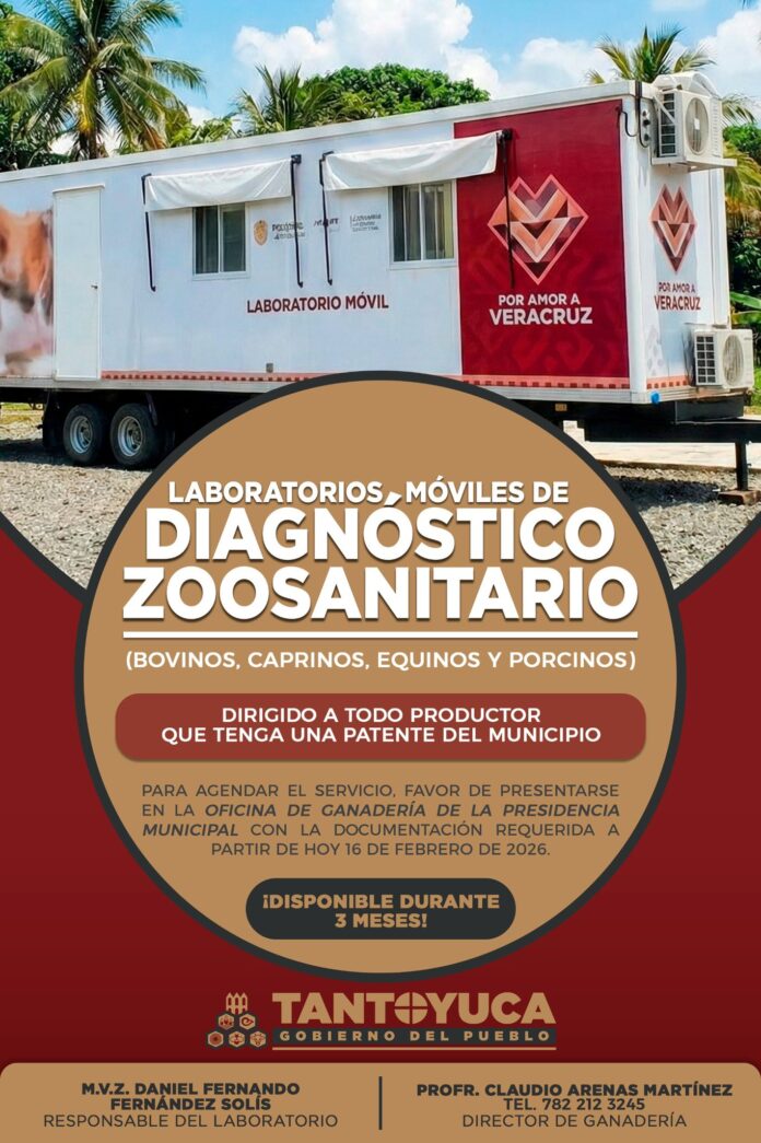 Con el objetivo de fortalecer la sanidad animal y mejorar la productividad del campo, el H. Ayuntamiento Municipal de Tantoyuca, en coordinación con la Dirección de Ganadería Municipal, invitó a las y los productores del municipio a presentar su documentación para realizar las solicitudes correspondientes y acceder al servicio de los Laboratorios Móviles de Diagnóstico Zoosanitario.