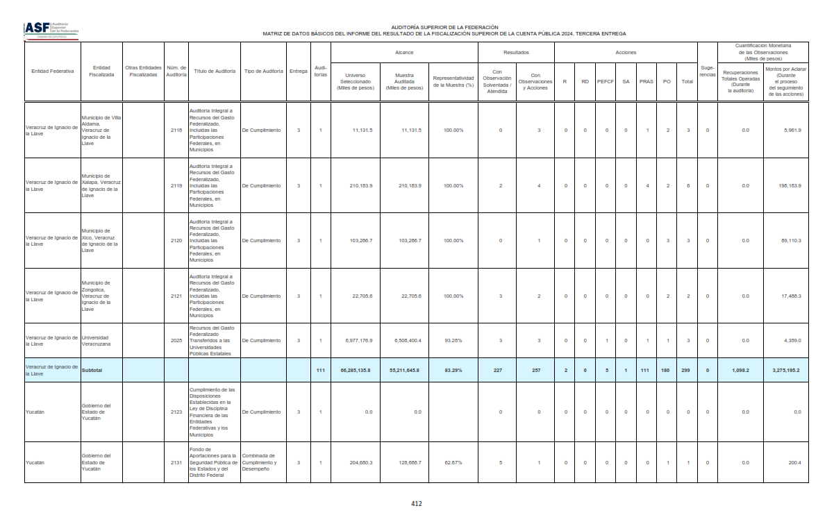 La Auditoría Superior de la Federación (ASF) reportó que, en el marco de la fiscalización de la Cuenta Pública 2024 (tercera entrega), en Veracruz se realizaron 111 auditorías vinculadas con gasto federalizado, con un universo seleccionado de 66.3 mil millones de pesos y una muestra auditada de 55.2 mil millones, equivalente a una representatividad de 83.29%. En ese mismo apartado, el informe consigna 3,275.2 millones de pesos por aclarar durante el seguimiento de acciones, así como recuperaciones operadas por 1.1 millones de pesos durante la auditoría.