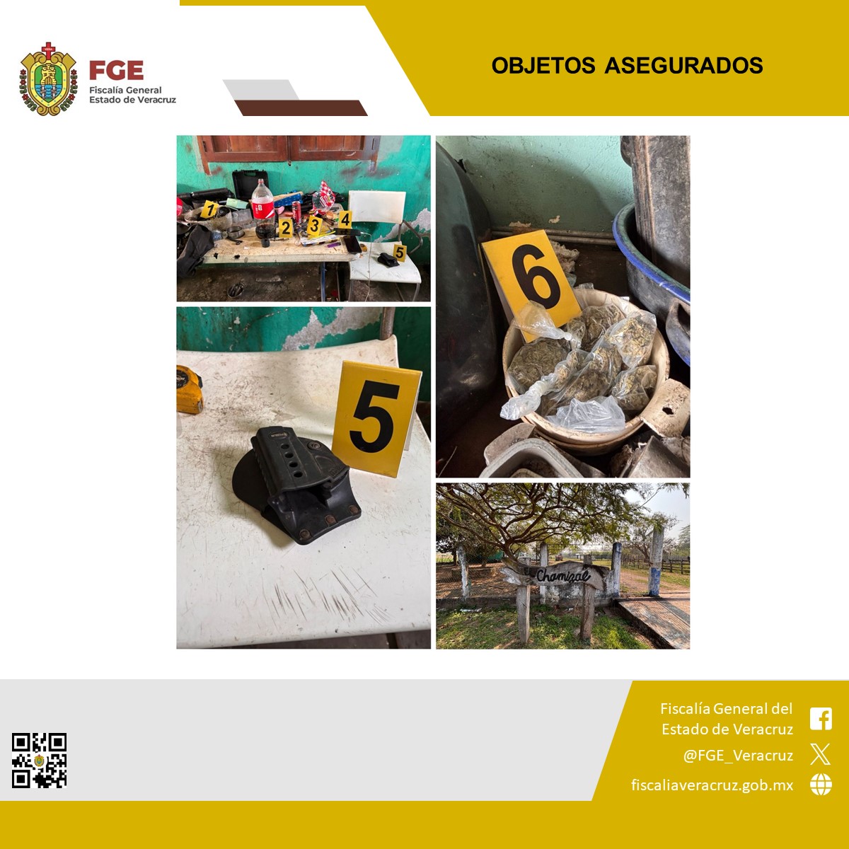 Durante el operativo, se aseguraron diversos indicios que serán integrados a la carpeta de investigación, entre ellos hierba verde seca con características similares a las de la marihuana, cartuchos balísticos, una pipa y celulares.