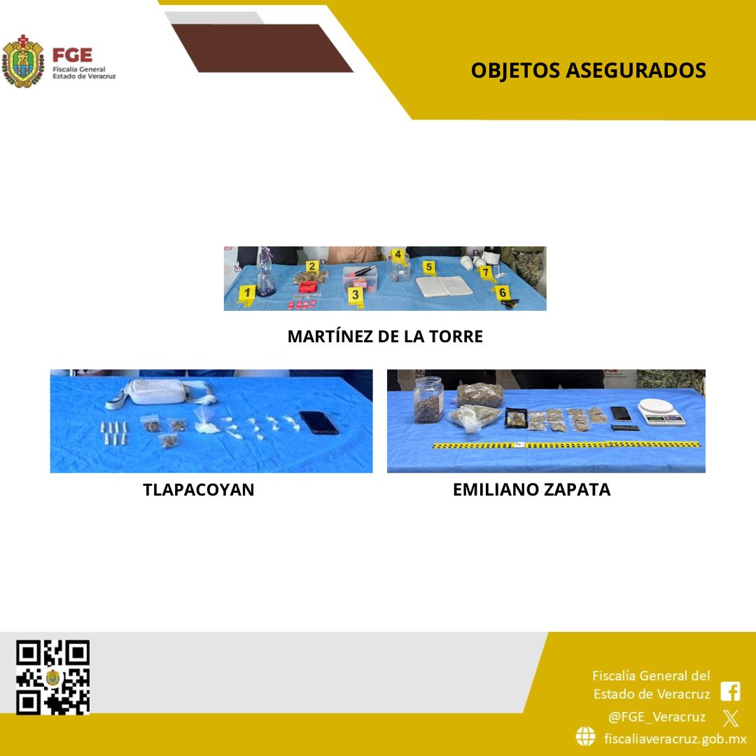 En Tlapacoyan, en la colonia Nezahualcóyotl, se detuvo en flagrancia a Elisa “N”. Durante la diligencia se aseguraron bolsas herméticas que contenían una sustancia granulada con características similares al cristal, hierba seca con características similares a la marihuana, así como cigarros elaborados con el mismo material.
