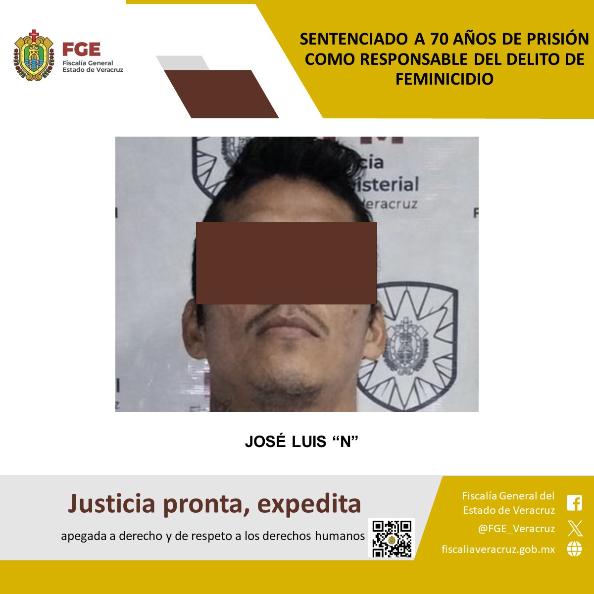 Coatzacoalcos, Ver., 20 de febrero de 2026.- La Fiscalía General del Estado, a través de la Fiscalía Coordinadora Especializada en Delitos contra las Mujeres, Feminicidio, Familia y Trata de Personas, informó que el órgano jurisdiccional emitió una sentencia condenatoria de 70 años de prisión en contra de José Luis “N”, al acreditarse su responsabilidad en el delito de feminicidio, cometido en agravio de una víctima cuya identidad se encuentra legalmente resguardada.