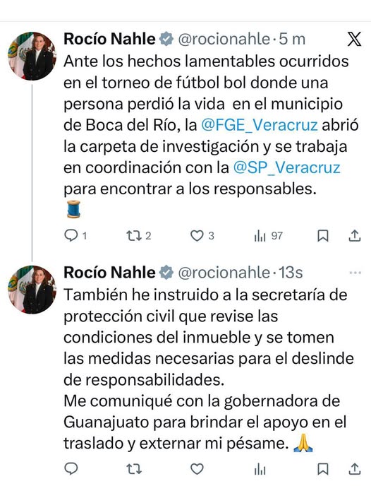 A través de un mensaje publicado en sus redes sociales, la gobernadora Rocío Nahle García señaló que las autoridades estatales ya dieron inicio a las diligencias correspondientes para esclarecer lo ocurrido y deslindar responsabilidades.